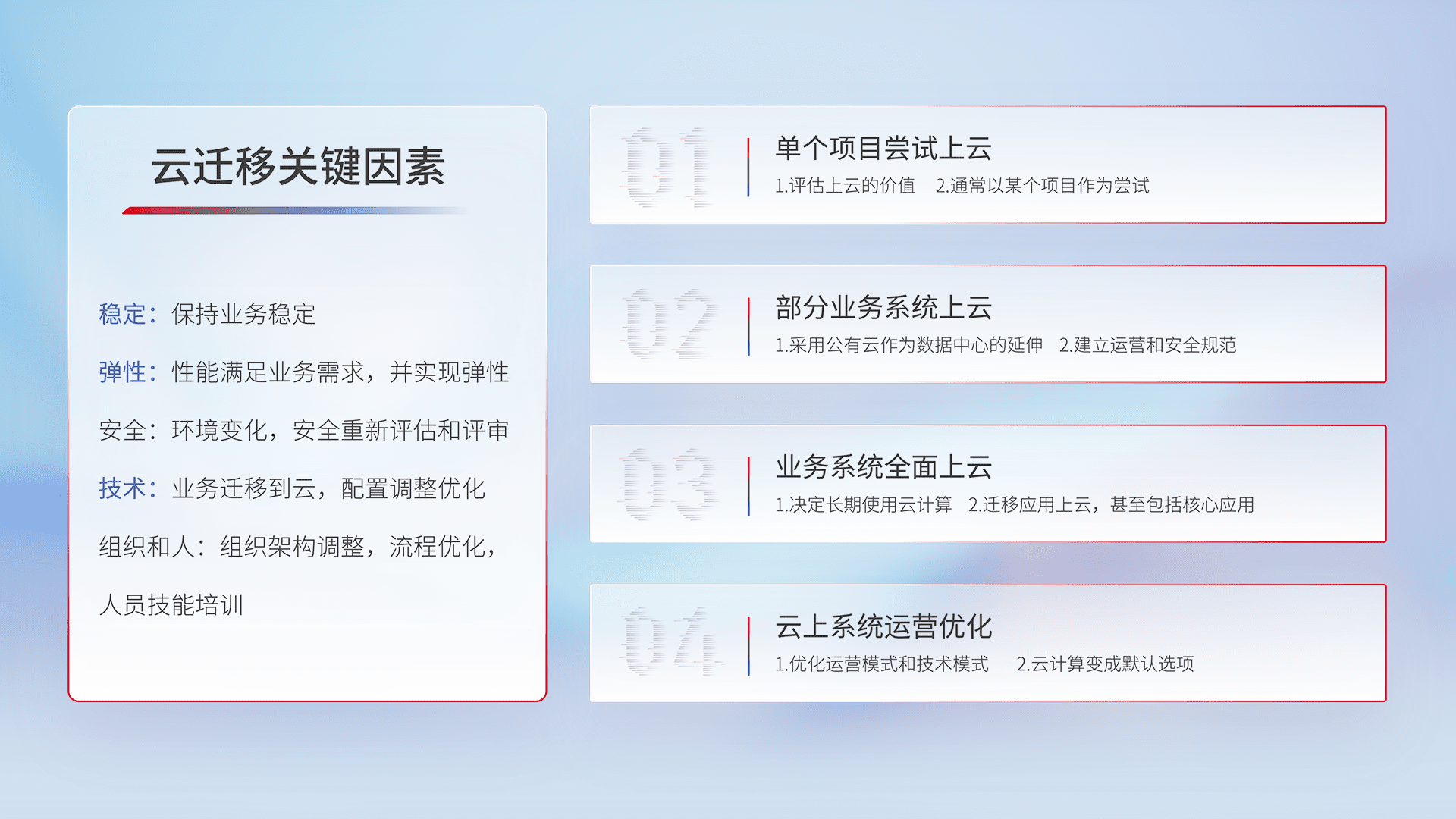 结合实际业务,,,从规划设计、、、云平台选型、、、云原生改造、、、数据迁移、、、集成交付,,迁移全过程为客户识别最佳上云路径,,,做好风险识别管理,,,,设计网络架构、、身份权限、、、安全审计合规、、、操作审计、、、、日志审计、、、监控告警策略、、多站点容灾设计等,,,对云上基础设施进行整体规划,,,提升IT治理水平,,,以满足弹性、、、高可用、、高性能的需求。。。