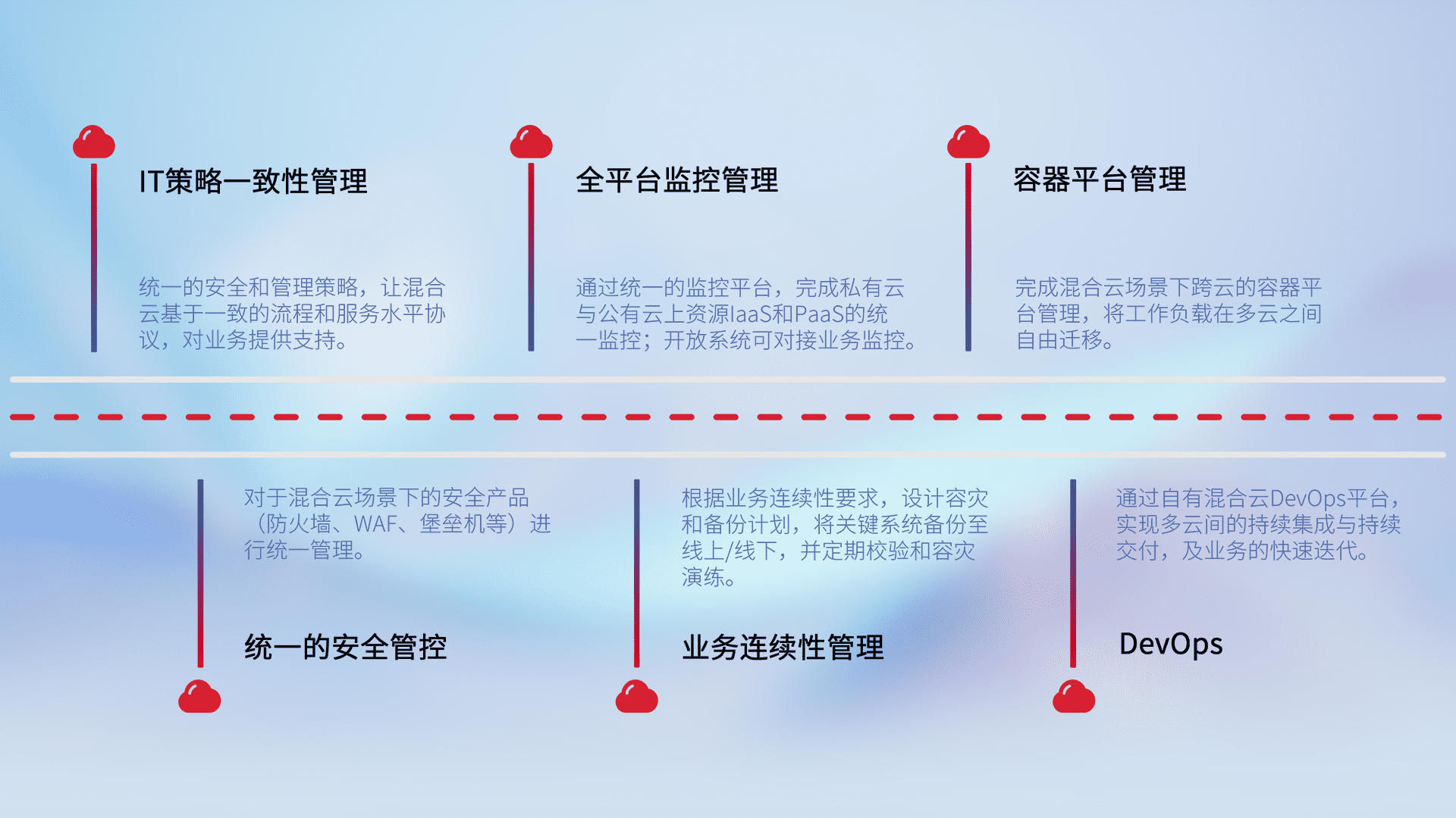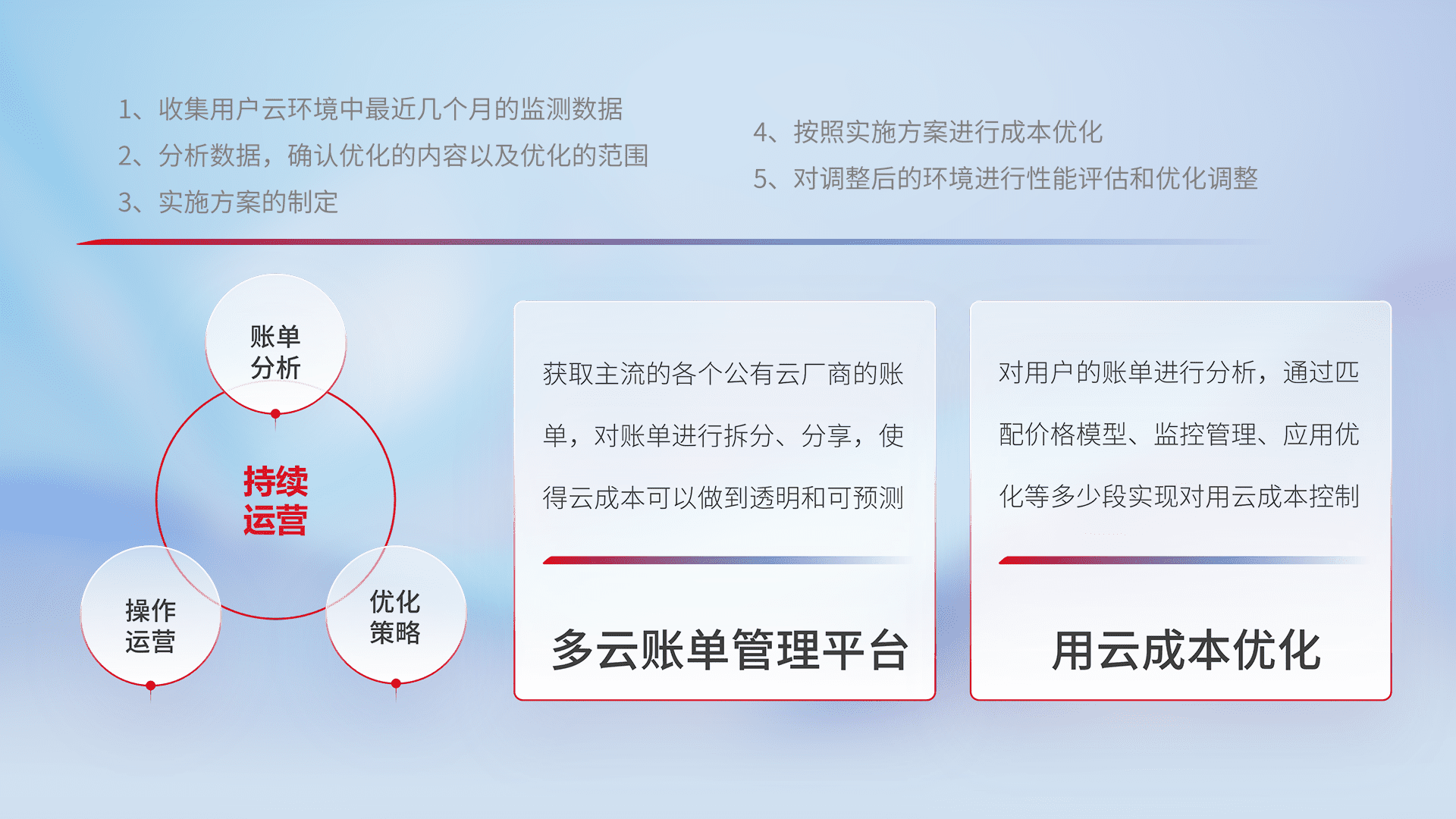 通过多云纳管,,,以统一的资源数据模型把客户的云资源进行抽象和封装,,,进而实现对多云资源的统一操作,,,,保障云资源管理的可靠性、、、、稳定性与可用性。。。量身定制化运维内容,,,配置、、、、开发运维、、、补丁管理、、、备份、、监控、、认证和访问管理、、、审计和日常巡检等,,,保障在用云过程中的可靠度,,,,稳定度以及高可用率。。。。