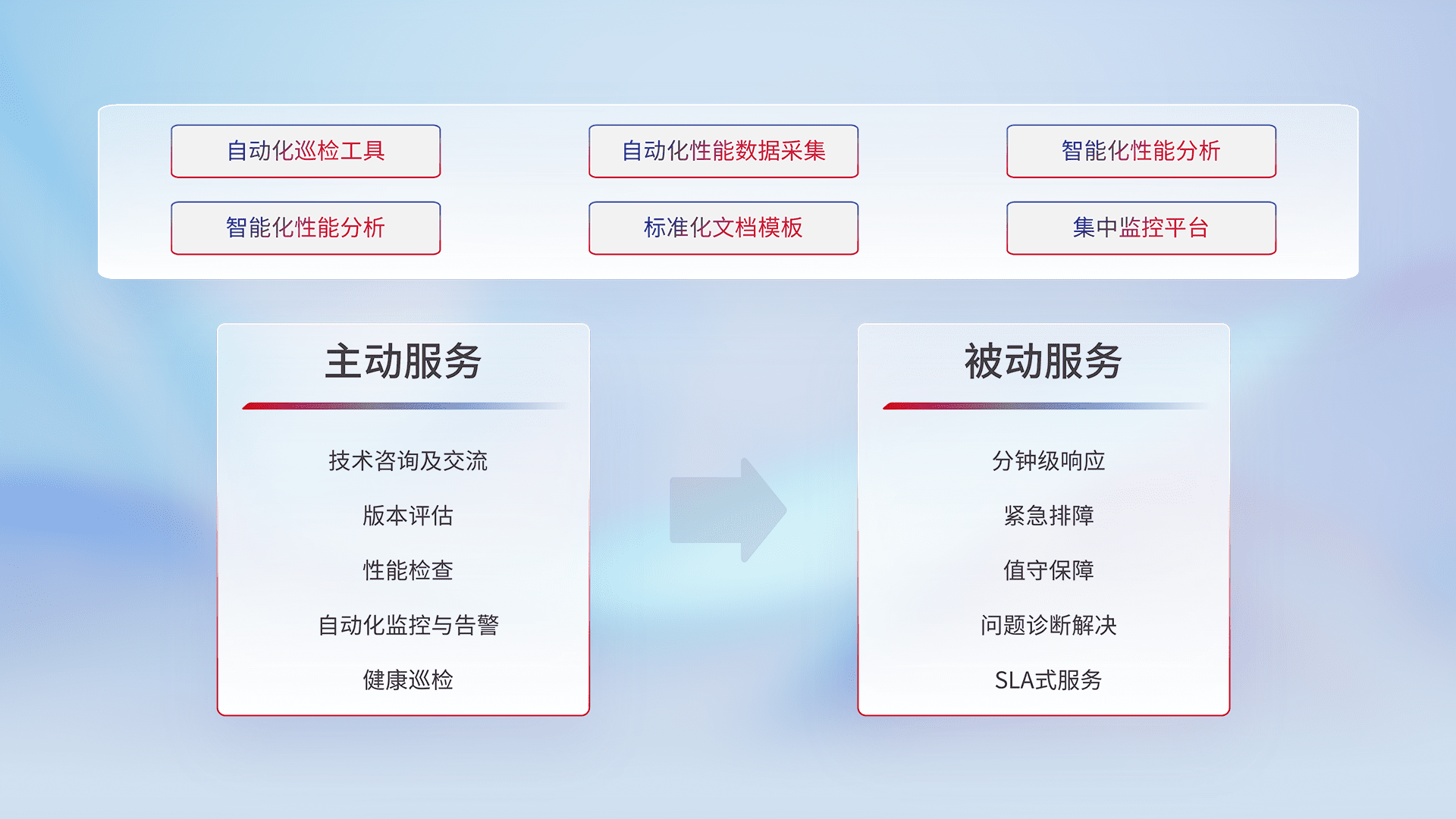 智能化工具和标准化文档,,,保障服务质量,,提供主动服务(包含技术咨询、、、版本评估、、、性能检查、、自动化监控与告警、、、、健康巡检)和被动服务包含(分钟级响应、、、紧急排障、、、值守保障、、问题诊断解决、、、、SLA服务)。。。。