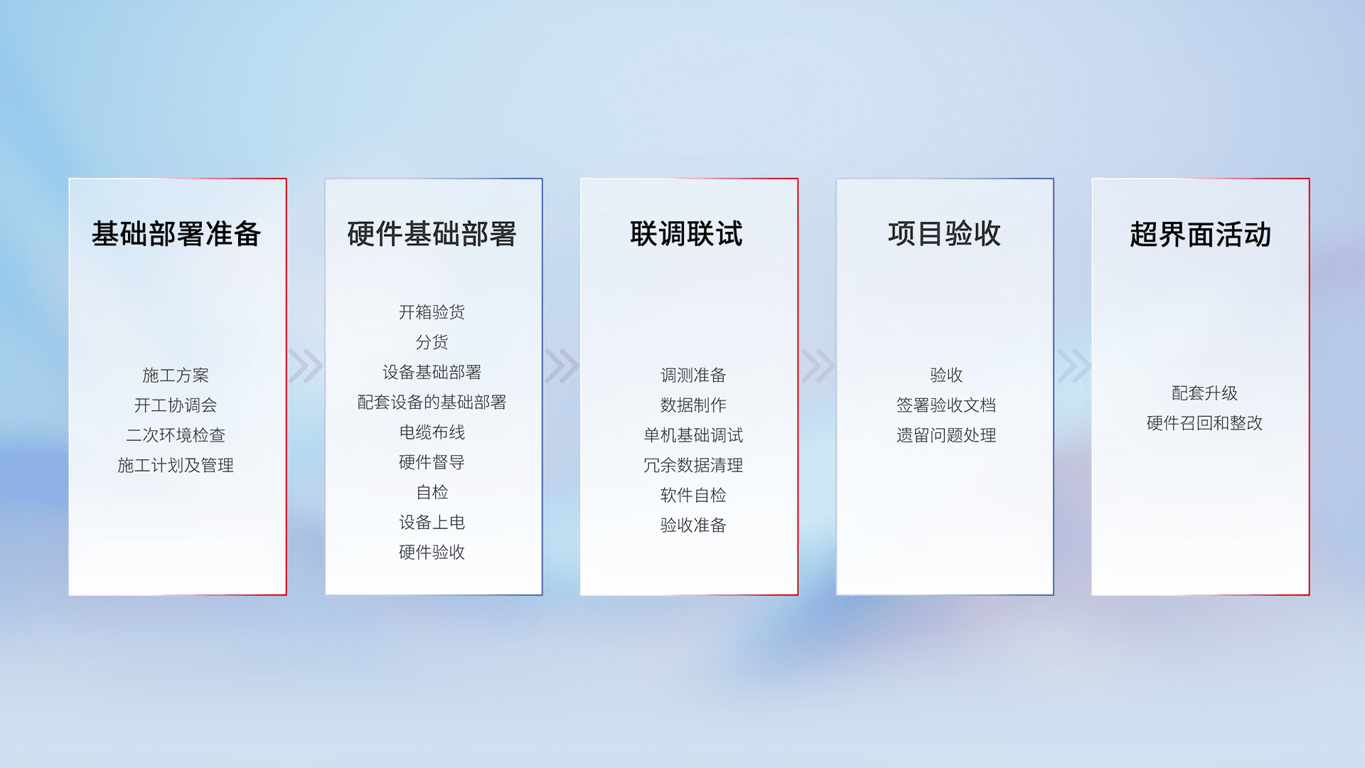 从基础部署准备、、、硬件基础部署、、、、联调联试、、项目验收、、越界面活动的全过程可追溯,,保证施工质量和进度。。。。